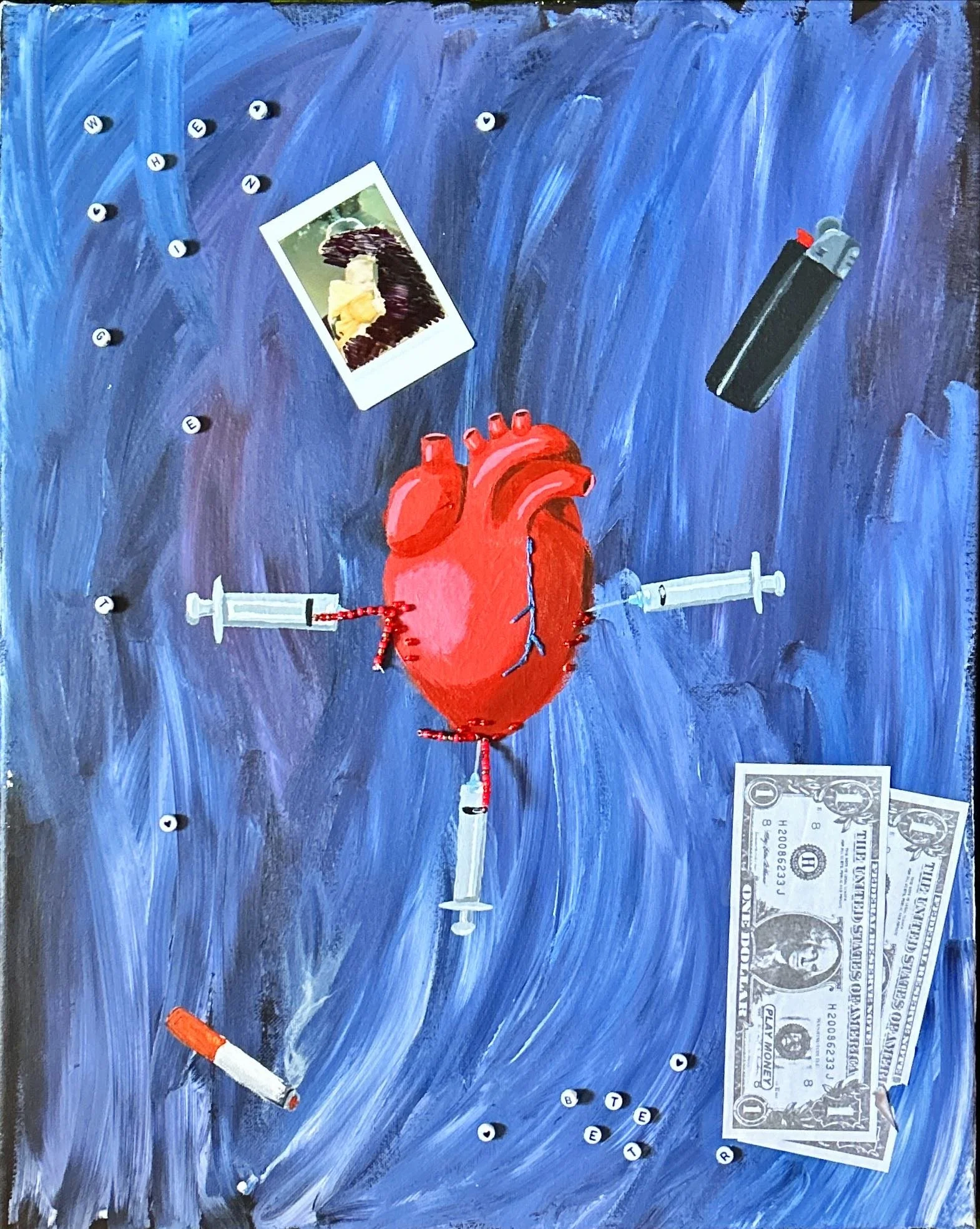 Acrylic Paint, Fake Money, Shoelace, 16”x20”, 2024